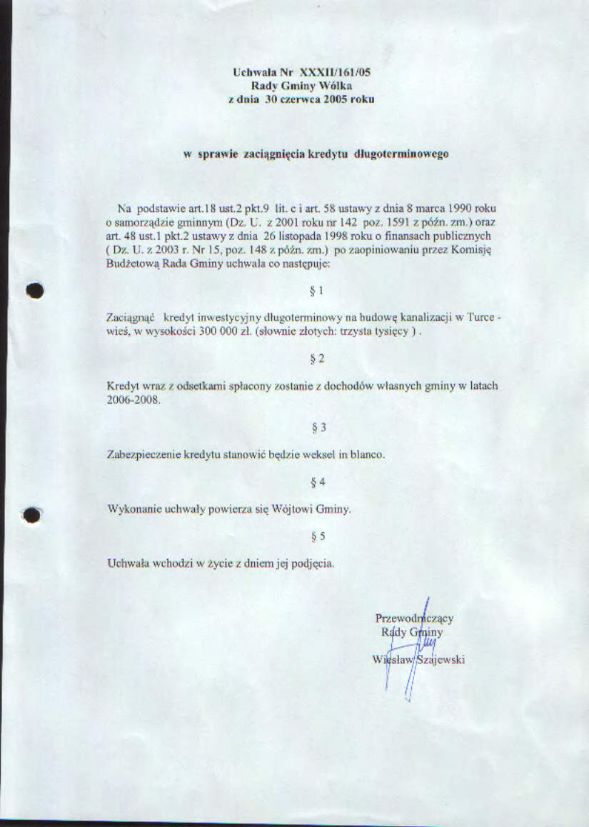 Uchwała Nr XXXII/161/05 w sprawie zaciągnięcia kredytu długoterminowego