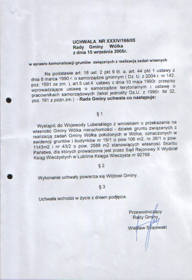 Uchwała XXXIV/166/05 Rady Gminy Wólka z dnia 15 września 2005r. w sprawie komunalizacji gruntów związanych z realizacją zadań własnych. 126.42 KB jpg Pobierz